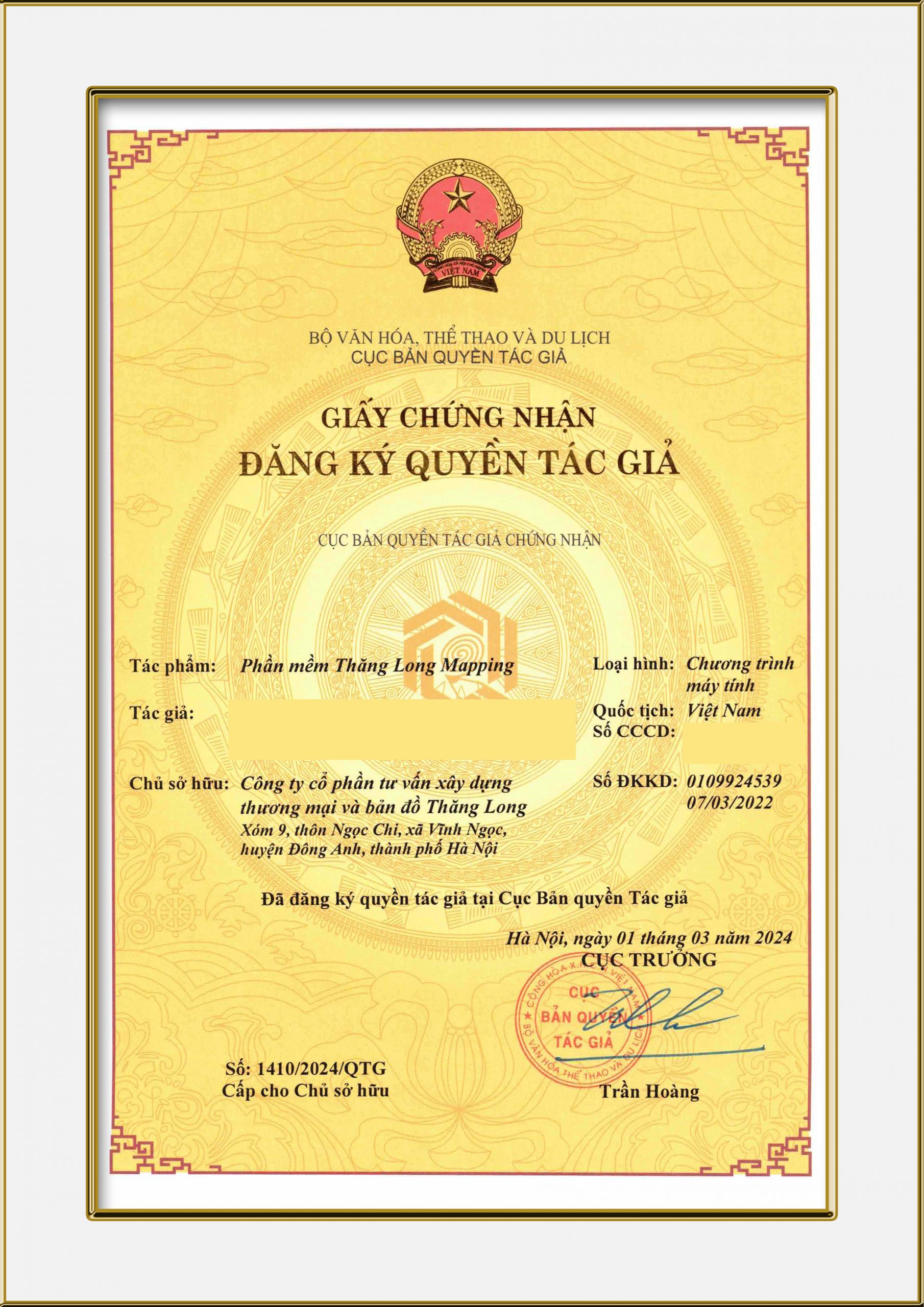 Giấy chứng nhận đăng ký bản quyền tác giả phần mềm Thăng Long Mapping