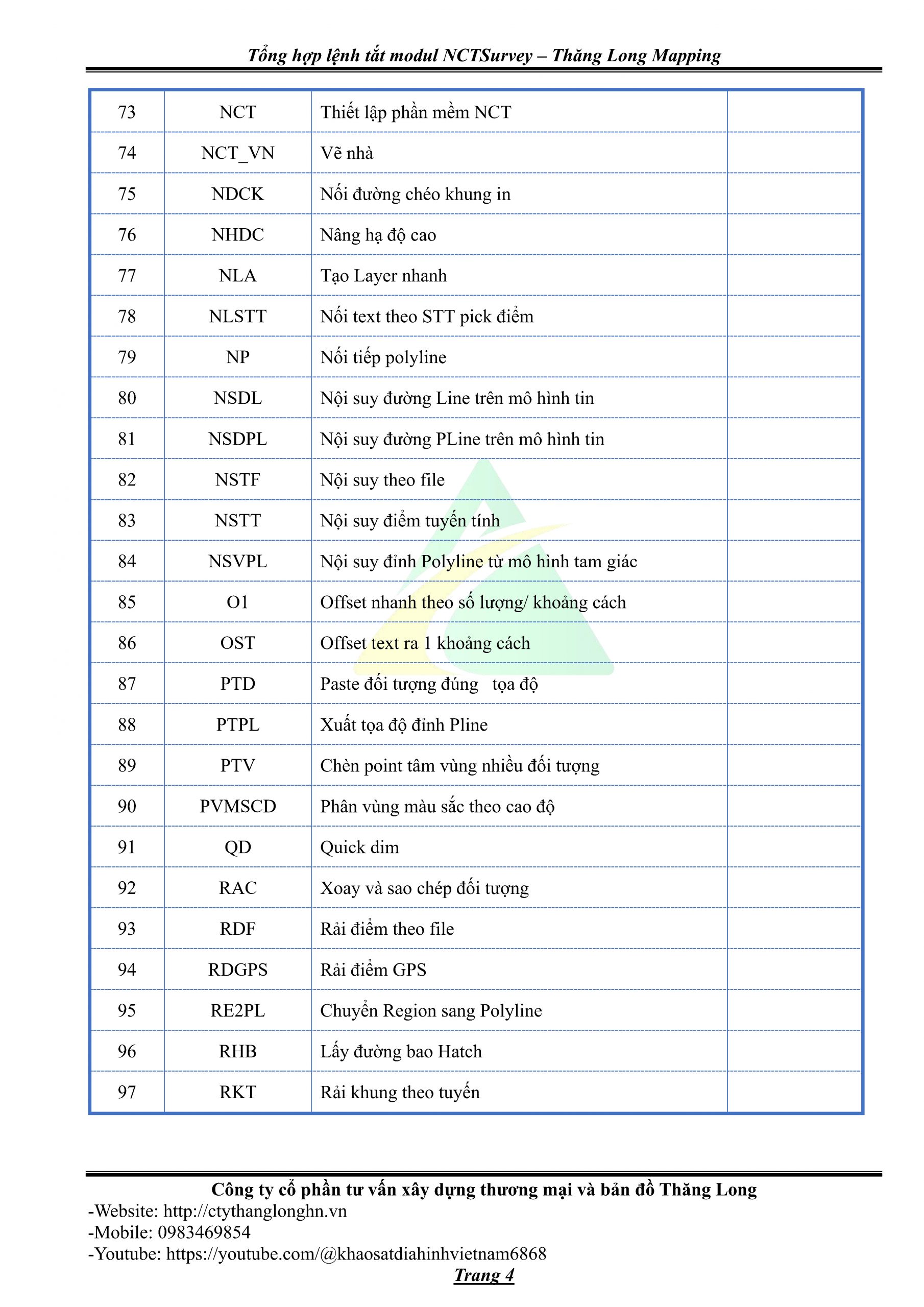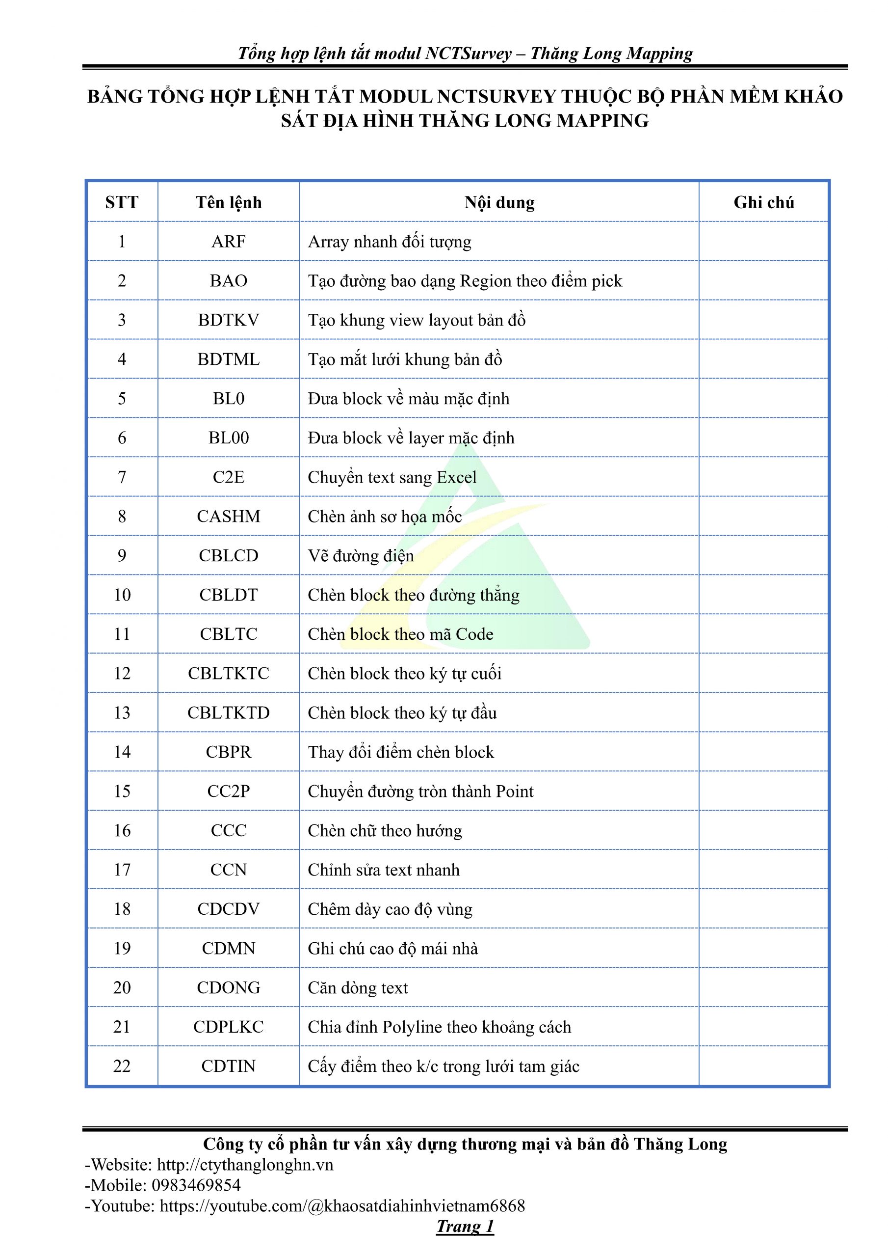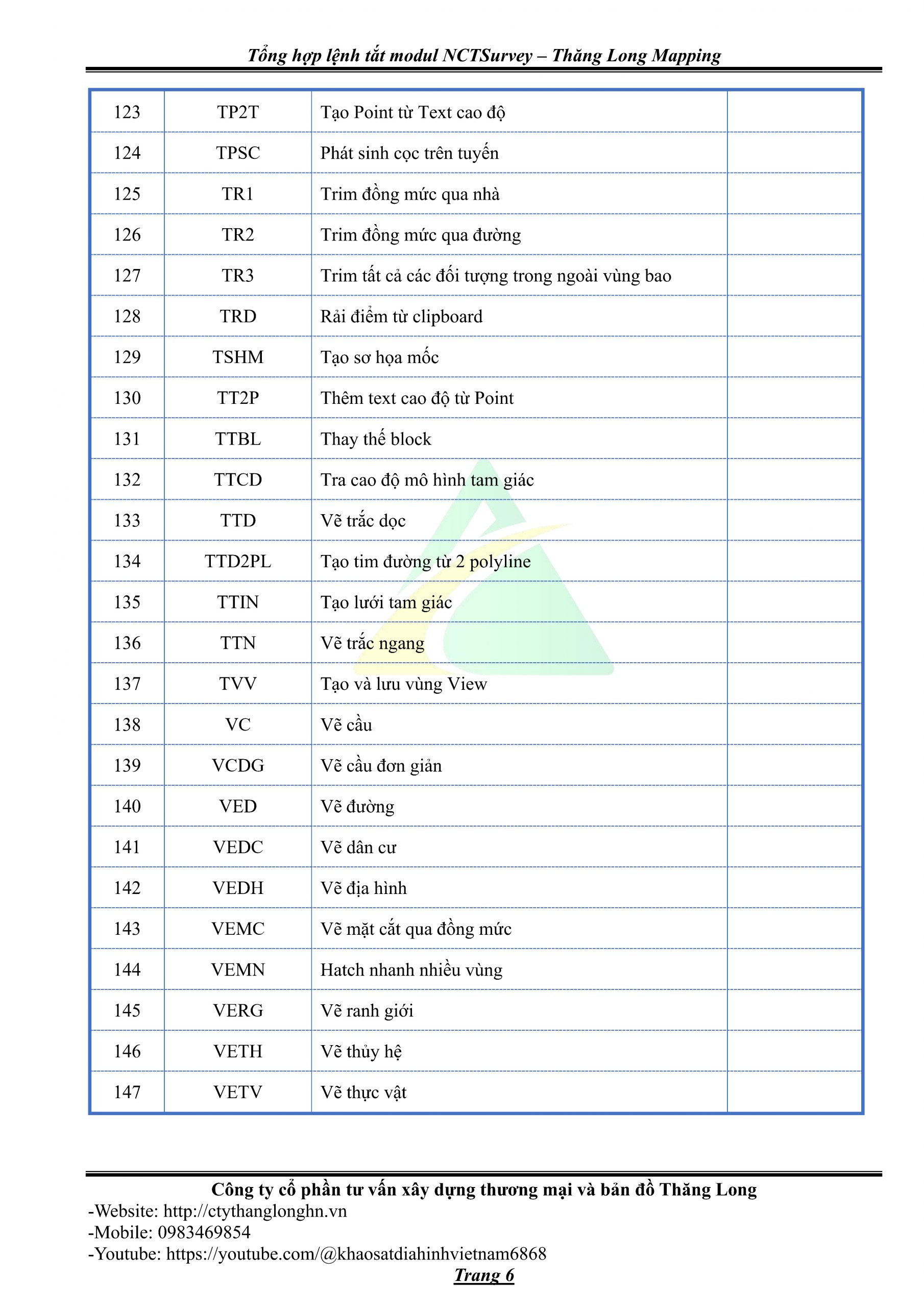 - Bảng tổng hợp lệnh tắt Modul NCTSurvey – Thăng Long Mapping