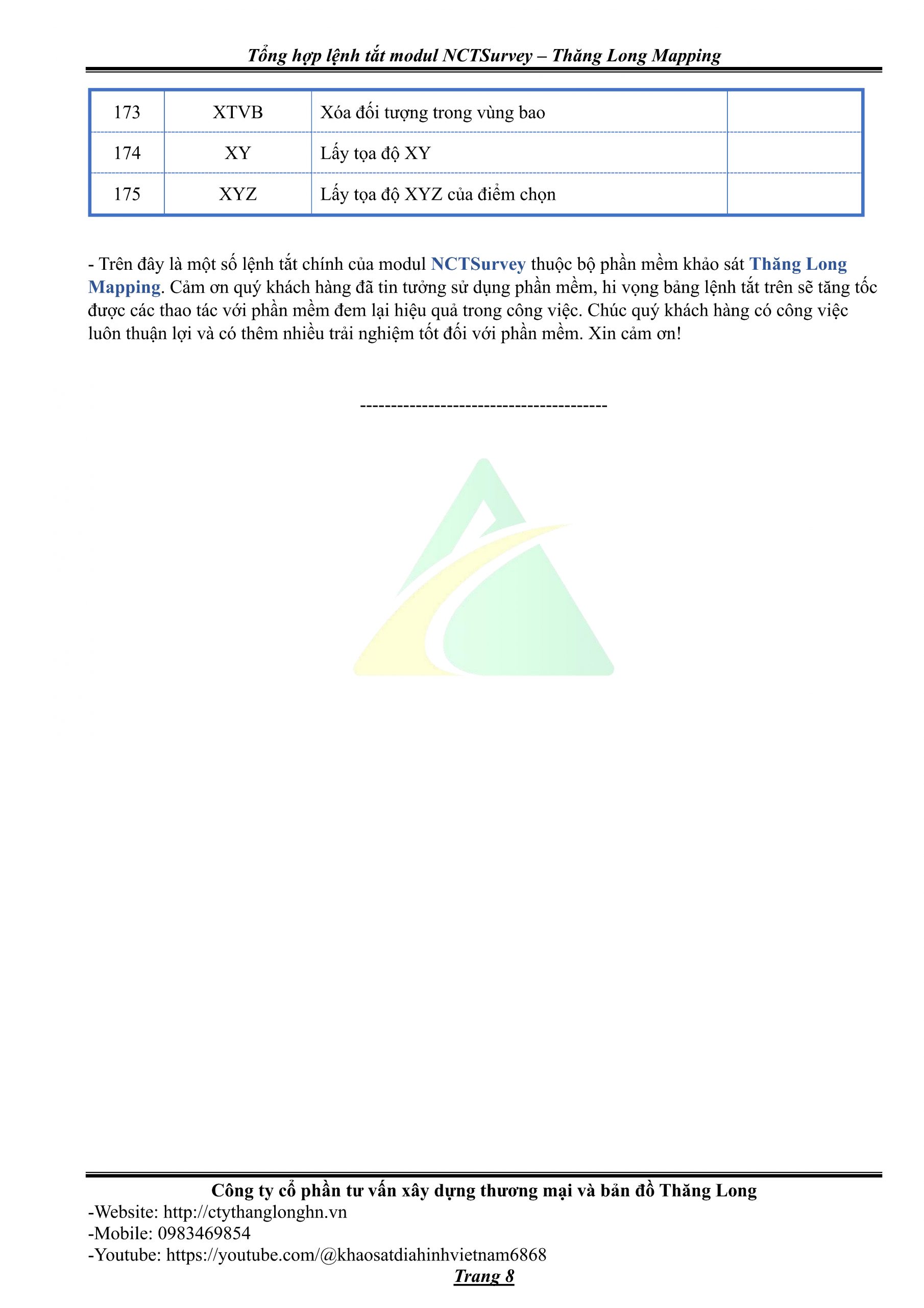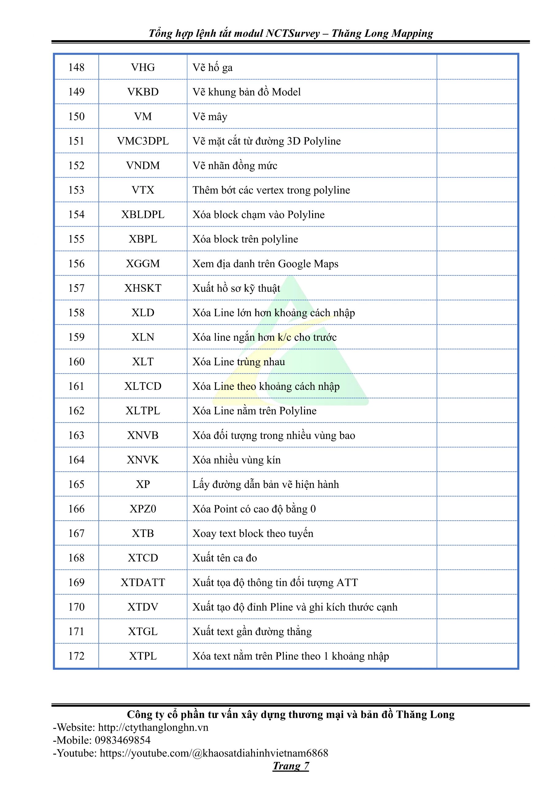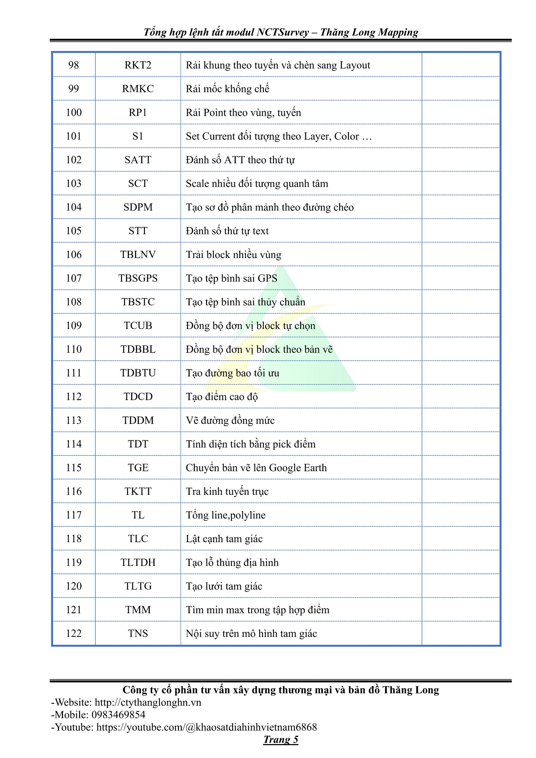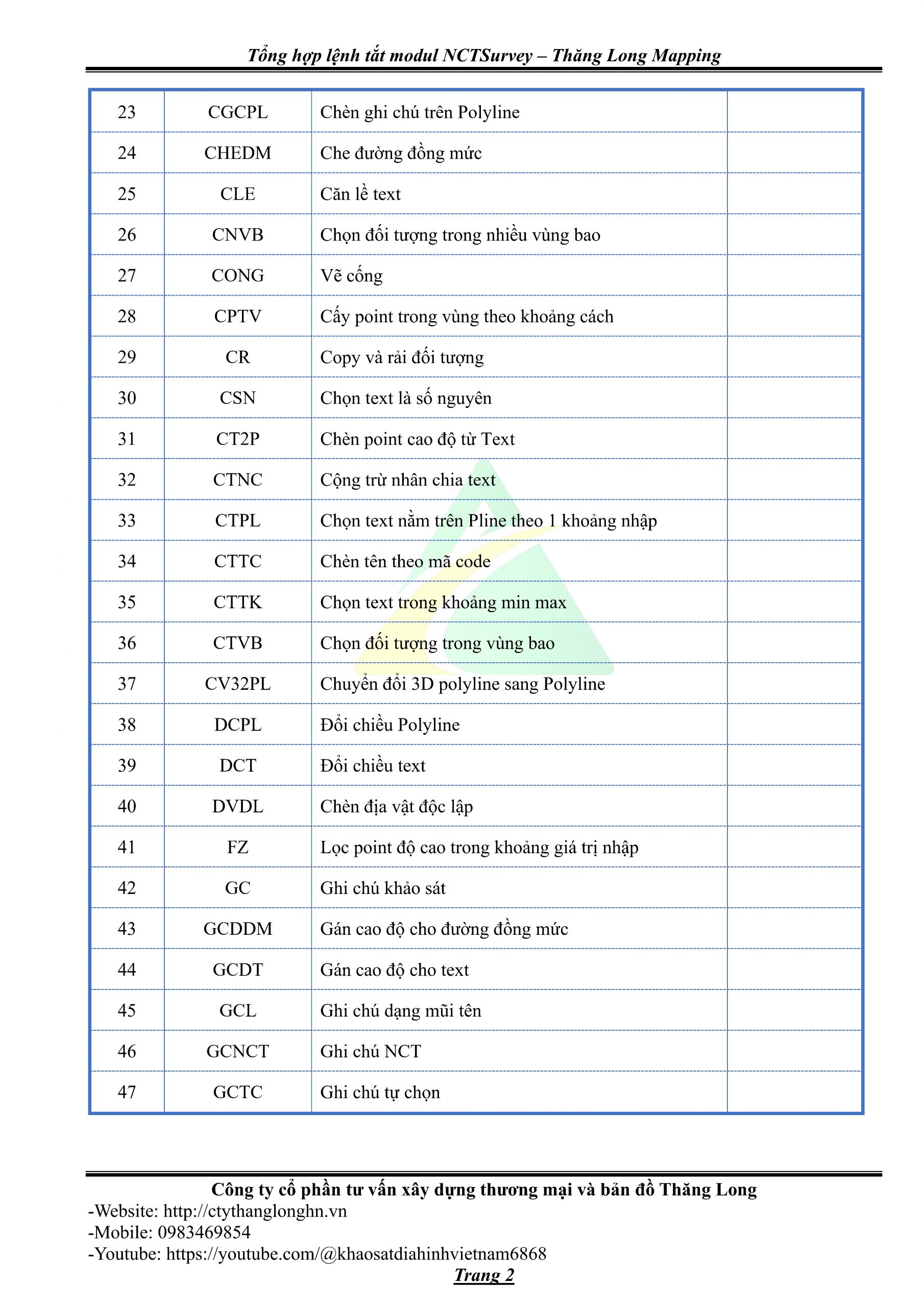 - Bảng tổng hợp lệnh tắt Modul NCTSurvey – Thăng Long Mapping